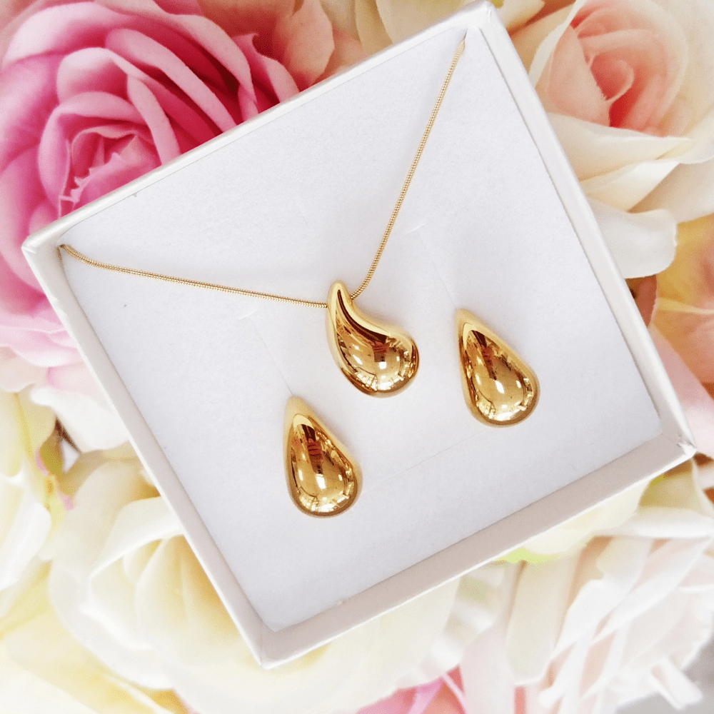 Komplet kolczyki złote M i naszyjnik łezka krople stal chirurgiczna 316L HIT