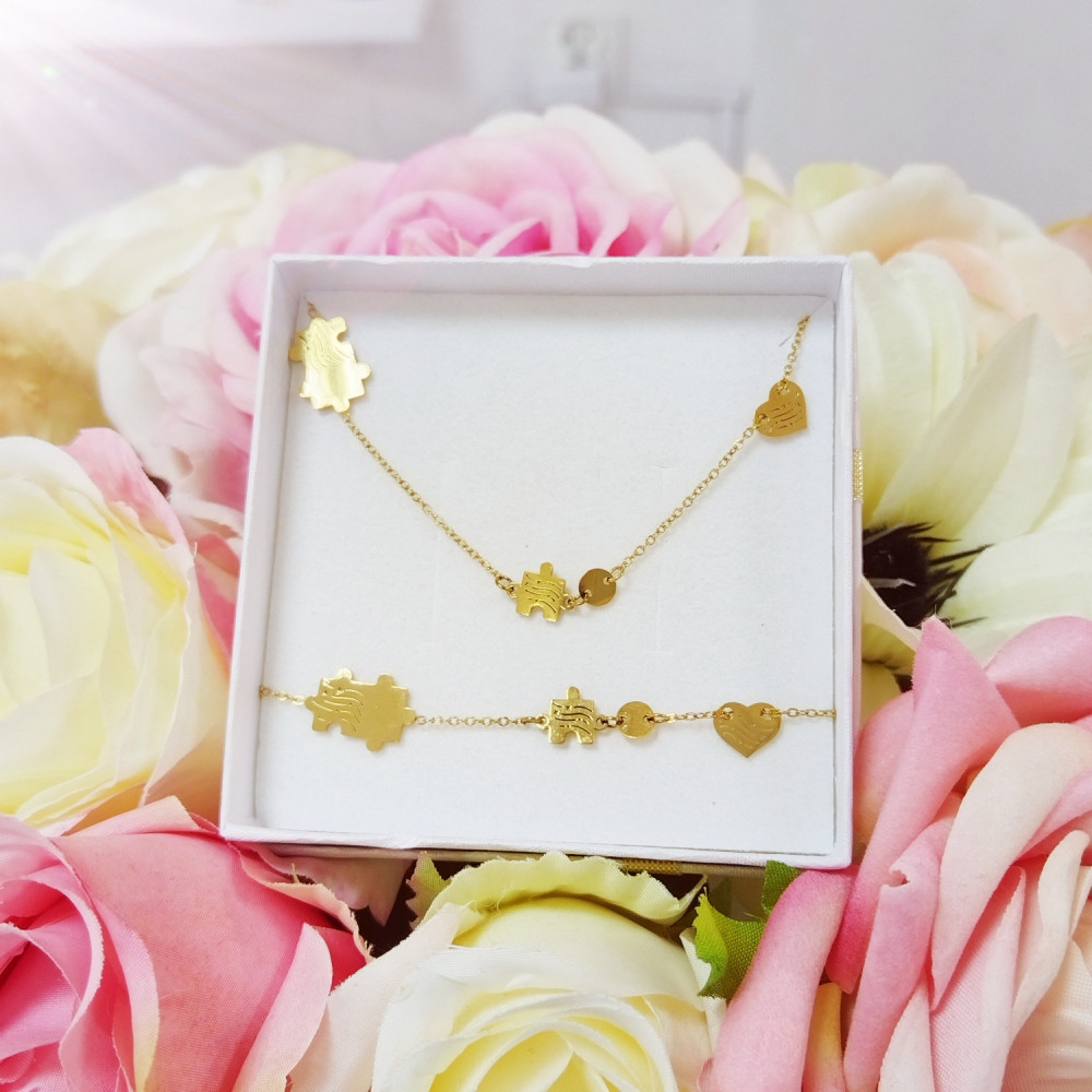 Komplet biżuterii złotej puzzle serce bransoletka i łańcuszek stal chirurgiczna 316L