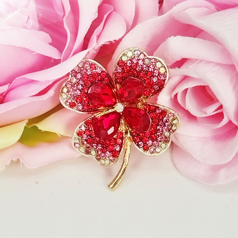 Broszka ozdobna koniczynka czerwona cyrkonie stal chirurgiczna